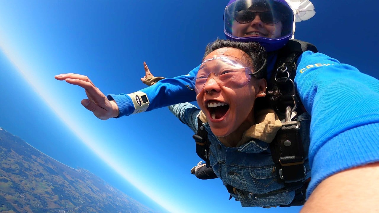我对这次跳伞真的非常紧张,在升空途中甚至因为紧张流下了眼泪,但这真的是一次绝妙的体验,等我们落地时,大家脸上都洋溢着笑容。我的双人跳伞教练——贝诺伊特——非常体贴,这让我彻底享受了这次体验。