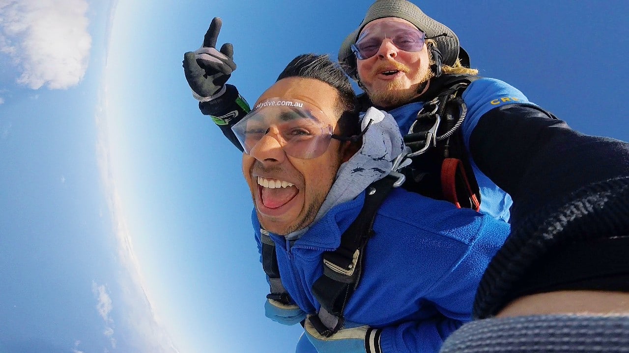 我与我的双人跳伞教练汤姆一起完成了人生中的第一次跳伞。这是我做过最令人胆战心惊、又最棒的事情!整个过程中我感到非常安全。眼前的景色美得令人难以置信。