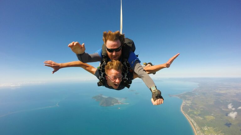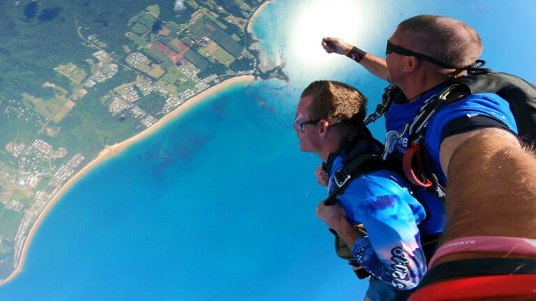 Skydive Misson Beach 美神滩跳伞是澳大利亚最壮丽的跳伞景观之一。从最高可达15,000英尺的高空自由落体,沿途尽览郁郁葱葱的雨林和大堡礁的壮丽景色,最终降落在美神滩的沙滩上。我们提供从凯恩斯市中心出发的免费往返接送服务,让您的冒险之旅从始至终轻松无忧。请放松身心,尽情沉浸在这热带风光中吧!